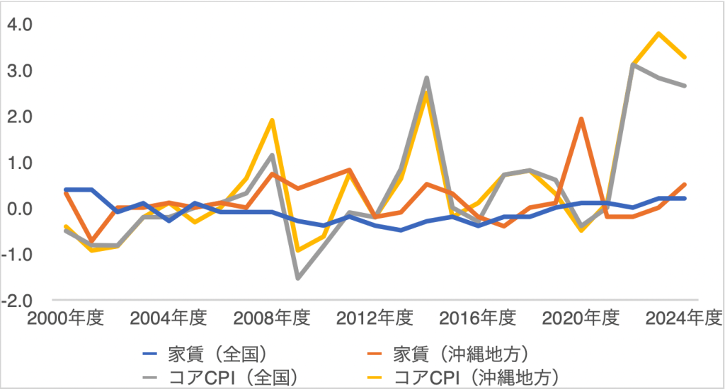 コアCPIとは「生鮮食品を除く総合」で、天候に左右されやすい生鮮食品の影響を除いた物価の変動を把握するために用いられます。また、本データは1970年代まで遡ることができますが、ここでは2000年度以降のデータをまとめました。それでは見ていきましょう。まずコアCPIは全国も沖縄地方も同じように変動しており、2022年度以降急上昇しているのがわかります。近年の物価上昇が顕著に数字に現れています。一方で、家賃に関しては、全国では変動が大きくありません。これは、賃料には『硬直性』があり、市場の変動に対して変化しにくい性質があることを裏付けています。しかし、沖縄地方の家賃に関しては、全国よりも上昇の幅が大きいと言えます。その背景には、人口動態がよるものに加えて、観光産業の影響を受けて転勤者や移住者が多いこと等の沖縄県特有の要因がいくつか考えられそうです。